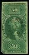 | 59 |  | | | Scott R101a 1862-71 $50 U.S. Internal Revenue, green S.S.S. & CO. black SON cds, F-VF corner thin |