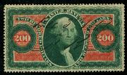 | 62 |  | | | Scott R102c 1862-71 $200 U.S. Internal Revenue, green & red beautiful centering, Extremely Fine appearance, light crease and two thins |
