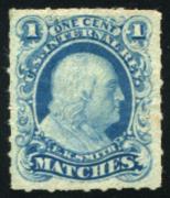 | 86 |  | | | Alligator Match Company. St. Louis, Missouri Scott RO7d 1878-83 1c blue on watermarked VF small thin |