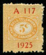 | Lot | | | Description | | 186 |  | | | Bell Telephone Co. of Canada Van Dam TBT83 1925 5c yellow mint, VF usual rough perfs |