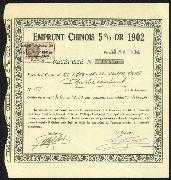 | 262 |  | | | Emprunt Chinois 5% OR 1902. Paris. 1930. Revenue stamp tied by Banque Franco-Asiatique cancel. VF |