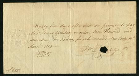 RM283b Die 1. Promissory note. New York, N.Y. 1814. Sharp strike, fold affects stamp, VF small hole cancel in signature, VF | Description |  | Scott RM283b 1814-17 $2.50 Eagle, embossed Die 1. Promissory note. New York, N.Y. 1814. Sharp strike, fold affects stamp, VF small hole cancel in signature, VF |  | Click here for High Definition Images | Bidding |  |