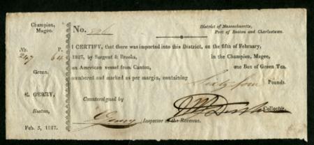 Type T-D. Import certificate for one box of green tea imported from Canton, China by Sargent & Brooks. 1827. Faint strike, VF