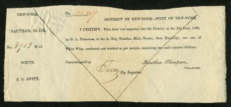 Type W-D. Import certificate for one case of White Wine from Marseille. 1826. Sharp strike, VF