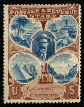William B. Hale, Postage & Revenue Stamp Merchant. Williamsville, Massachusetts. 1P brown & blue. Mint, F | Description |  | William B. Hale, Postage & Revenue Stamp Merchant. Williamsville, Massachusetts. 1P brown & blue. Vignettes of Hale and scenes from Hawaii, Newfoundland, Egypt, and Switzerland. Mint, F |  | Bidding |  |