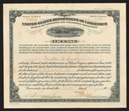 U.S. Department of Commerce, Bureau of Navigation and Steamboat Inspection License | Description |  | U.S. Department of Commerce, Bureau of Navigation and Steamboat Inspection, License to Operate or Navigate Vessels Not More Than Sixty-Five Feet in Length Propelled by Machinery, and Carrying Passesngers for Hire, and Vessels of Fifteen Gross Ton or Less, Propelled in Whole or in Part by Gas, Gasoline, Petroleum, Naphtha, Fluid, or Electricity, and Carrying Passengers for Hire. 1936. VF folds and faint toning |  | Click here for High Definition Images | Bidding |  |
