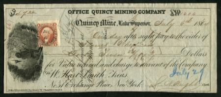 Quincy Mining Company sight draft. Quincy Mine, Lake Superior, Michigan. 1864. Stamp tied by a black SON handstamp. VF