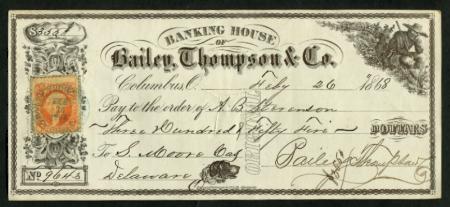 Banking House of Bailey, Thompson & Co. bank draft. Columbus, Ohio. 1868. Stamp tied by blue oval handstamp. Vignette of hunter with rifle and dog. VF