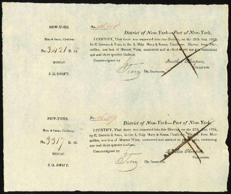 type W-D. Vertical pair of import certificates, each for one box of Muscat Wine imported from Marseilles, France. 1825. Sharp strikes, VF small document faults