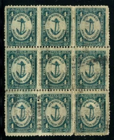 RO33d block of nine, black handstamp cancel, F-VF hinge reinforced, small flaws | Description |  | Wm. Bond & Co. Anchor Match. Portland, Oregon Scott RO33d 1878-83 4c green on watermarked block of nine, black handstamp cancel, F-VF hinge reinforced, small flaws |  | | Bidding |  |