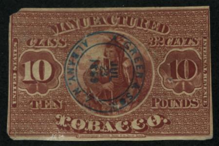 TF10 A. GREEN & SON, ALBANY, N.Y. blue SON handstamp, cut cancel, F appearance, couple thins, internal tear and corner nick | Description |  | Springer TF10 1868 Issue 10 lb. red brown (Indian smoking) A. GREEN & SON, ALBANY, N.Y. blue SON handstamp, cut cancel, F appearance, couple thins, internal tear and corner nick |  | | Bidding |  |