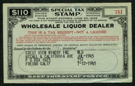 Wholesale Liquor Dealer F.Y.E. 1946 $110 black & red (pale green s.c.), VF tack holes and tiny margin tear