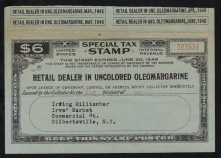 Retail Dealer in Uncolored Oleomargarine F.Y.E. 1946 $6 black (pale green s.c.), with coupons, VF creases