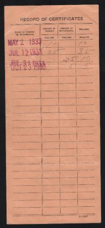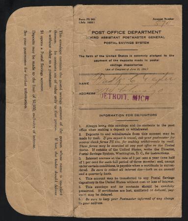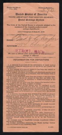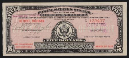 Postal Savings System Certificate of Deposit Series of 1917 $5. Detroit, Michigan. Includes information for depositors and envelope