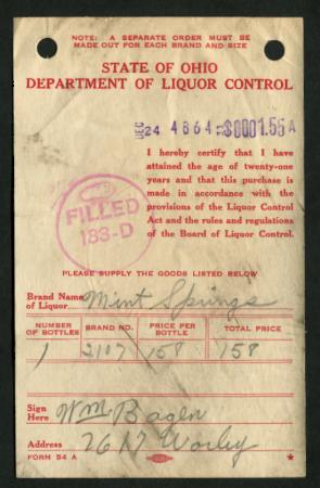 OH Department of Liquor Control order form certifying that the purchaser has attained 21 years of age. F-VF light soiling