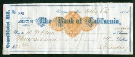 Scott RN-D1. Virginia, Nevada. Agency of The Bank of California, Consolidated Mill bank check. 1874-75. Blue on white. John W. Mackay autograph. Used, VF light soiling