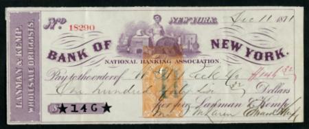 RN-E4 New York, N.Y. Bank of New York Lanman & Kemp, Wholesale Druggists. | Description |  | Scott RN-E4. New York, N.Y. Bank of New York, Lanman & Kemp, Wholesale Druggists bank check. 1871. Violet on white. Vignette of woman with pharmacal supplies, ship in background. Used, VF |  | | Bidding |  |