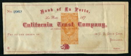 RN-E7 La Porte, California. Bank of La Porte | Description |  | Scott RN-E7. La Porte, California. Bank of La Porte draft drawn on California Trust Company. 187_. Red on white. Printed by Waters, Newhoff & Co., Printers, San Francisco. Small dog. Unused, F-VF light stain, used for letter on back |  | | Bidding |  |