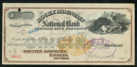 Scott RN-F1. Central City, Colorado. Rocky Mountain National Bank bill of exchange drawn on Kountze Brother Bankers, New York. 1876. Black & brown on white. Printed by National Bank Note Co., New York. Indian fighting bear, horse and bear cub. Used, VF