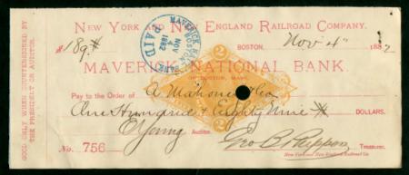 Scott RN-G1. Boston, Massachusetts. Maverick National Bank, New York and New England Railroad Company bank check. 1882. Red on white. Used, VF