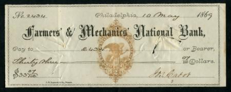 Scott RN-H3. Philadelphia, Pennsylvania. Farmers' & Mechanics' National Bank bank check. 1869. Black on white. Printed by J.B. Lippincott & Co., Printers. Used, VF