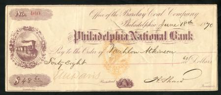 Scott RN-H3. Philadelphia, Pennsylvania. Philadelphia National Bank, Barclay Coal Company bank check. 1870. Purple on cream. Printed by J. Haehnlen, Phila. Train, beehive. Used, VF