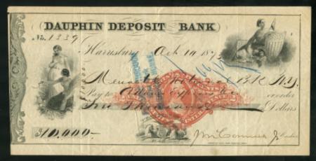 Scott RN-J5. Harrisburg, Pennsylvania. Dauphin Deposit Bank draft. 1873. Black on white. Printed by American Bank Note Co., Philadelphia. Women in field, woman with shield. Used, F-VF