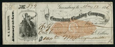 RN-K5 Greensburg, Pennsylvania. Greensburg Banking Company W.H. Klinginsmith, Attorney at Law | Description |  | Scott RN-K5. Greensburg, Pennsylvania. Greensburg Banking Company, W.H. Klinginsmith, Attorney at Law bank check. 1876. Black on white. Printed by Wm. Mann, 529 Market St., Philadelphia. Commerce. Used, VF |  | | Click here for High Definition Images | | Bidding |  |