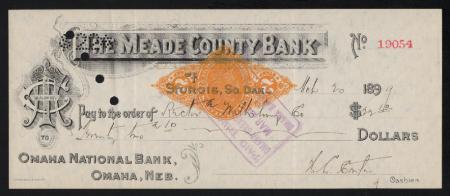 RN-X7g stamp inverted. Sturgis, South Dakota. Meade County Bank bank check