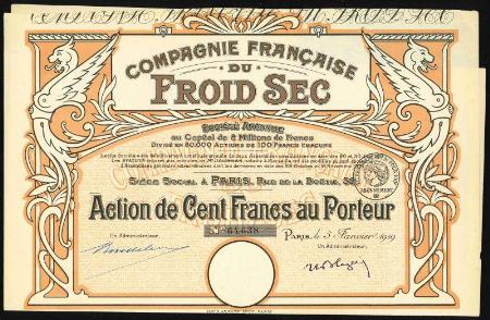 FRANCE Compagnie Francaise du Froid Sec stock certificate. Paris. 1919