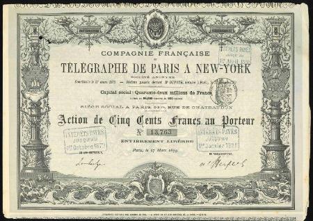 FRANCE Compagnie Francaise du Telegraphe de Paris a New-York stock certificate. Paris. 1879