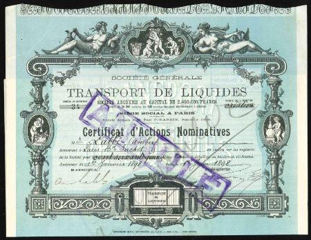 FRANCE Transport de Liquides stock certificate. Paris. 1898