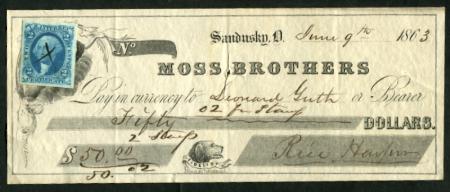 Moss Brothers bank check. Sundusky, Ohio. 1863. VF