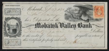 R15c The National Mohawk Valley Bank certificate of deposit. Mohawk, New York. 1870. American Bank Note Co. New York imprint. Vignettes of canal boat and eagle with small train. VF