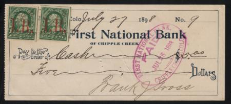 R154 two singles, First National Bank of Cripple Creek bank check. Cripple Creek, Colorado. 1898. VF