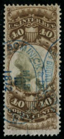 Dominick & Dickerman. R105 blue oval handstamps, VF | Description |  | Dominick & Dickerman. New York, N.Y. Scott R141 1871-72 40c brown & black blue oval handstamps, VF