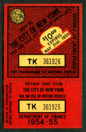 New York City Motor Vehicle Use Tax 1954-55 mint, VF small faults