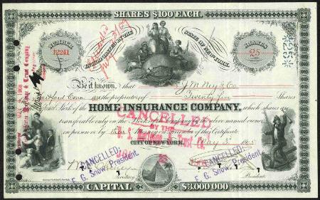 Home Insurance Company stock certificate. New York, N.Y. 1905