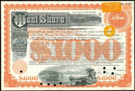 West Shore Railroad Company $1,000 First Mortgage Guaranteed Bond. New York. 1948. American Bank Note Company, New York imprint. Lake vignette with steamboats, sailing ship and train. Netherlands imprinted revenue stamp. Cancelled, VF