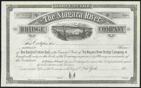 Niagara River Bridge Co. stock certificate. New York, N.Y. 188_. Bridge vignette. Unissued, VF