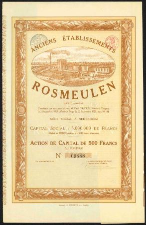 BELGIUM Anciens Etablissements Rosmeulen stock certificate. Nedeerheim. 1920
