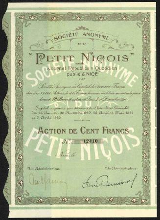 FRANCE Petit Nicois stock certificate. Paris. 1924