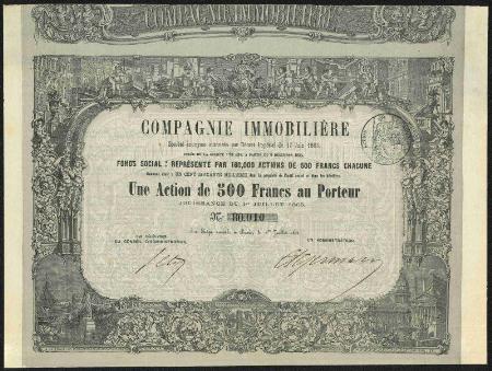 FRANCE Compagnie Immobiliere stock certificate. Paris. 1863