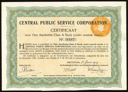 NETHERLANDS Central Public Service Corporation Class A stock certificate. Amsterdam. 1929