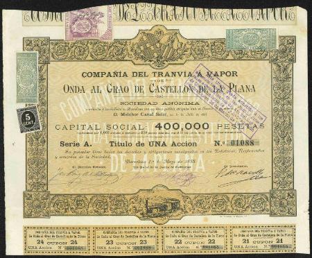 Compania Del Tranvia A Vapor De Onda Al Grao De Castellon De La Plana stock certificate. Barcelona. 1888. Spain adhesive revenue stamps. Cancelled, VF