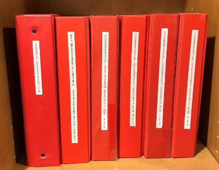A wealth of information, hundreds of pages in six binders includes the Newsletter, two catalogs by Bonney & Lane, and four binders of printouts concerning various company overprints organized alphbetically. 2003-15. VF and useful.