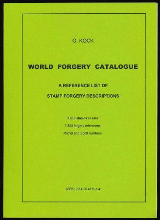 Kock, J. World Forgery Catalog, A Reference List olf Stamp Forgery Descriptions | Description |  | World Forgery Catalog, A Reference List of Stamp Forgery Descriptions by J. Kock. A listing of forgeries by country, issue date, denomination, Michel & Scott numbers, and literature references with page numbers. Very useful. 1998. Card covers. 89 pages. Used, VF |  | | Bidding |  |