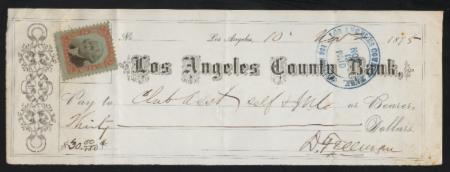 Los Angeles County bank check. Los Angeles, California. 1875. F-VF