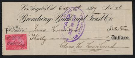 Broadway Bank and Trust Co. bank check. Los Angeles, California. 1898. VF