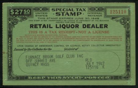 Retail Liquor Dealer F.Y.E. 1948 $27.50 black & red (green s.c.) VF crease, tack holes